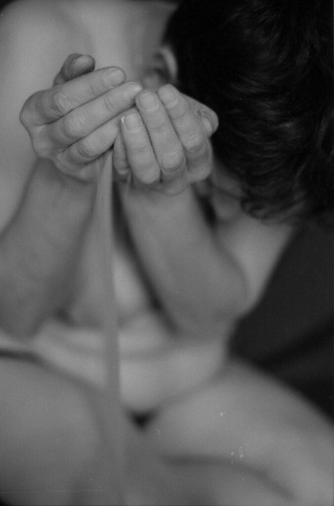 Diplômée en 2001 en Arts Plastiques à l’école “le 75” à Bruxelles et principalement formée en graphisme, je choisis de me consacrer entièrement à la photographie en 2022. Activiste, je me suis également beaucoup investie dans la photo documentaire lors de manifestations, à Bruxelles et à Paris. En 2022, je commence une collaboration avec le projet International Fotografar Palavras, basé au Portugal, mettant en lien des écrivain.e.s, photographes et vidéastes, traduisant des extraits de textes d’auteur.ice.s en images. Au fil du temps, cette collaboration a donné vie à un projet intime et universel à la fois. Il explore l’universalité des émotions à travers la photoperformance et l’autoportrait. Au-delà des aspects esthétiques et thérapeutiques, je souhaite poursuivre une approche émotionnelle, interrogative et/ou militante. Un trauma intergénérationnel lié à la Shoah, un trauma émotionnel lié au silence suite à un vécu émotionnel intime : ces vécus sont à la fois si loins et si proches car ils génèrent un questionnement autour des concepts de mémoire et de vide. Cette reconnection à l’histoire personnelle et traumatique s’articule autour du corps en tant qu’élément social et parfois politique (“07.10.23” faisant référence au pogrom du 07.10.23 en Israël, écho à la Shoah). Les photoperformances y sont montrées sans tabou et brutes.